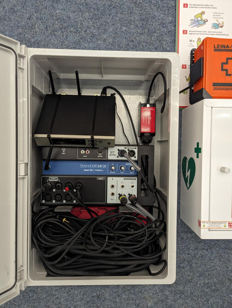 Installiert wurde 2x Aktive Fullranger 600W RMS, 130dB max, Sennheiser Funkstrecke und ein digitales Mischpult um den Hallensound optimal einzustellen.